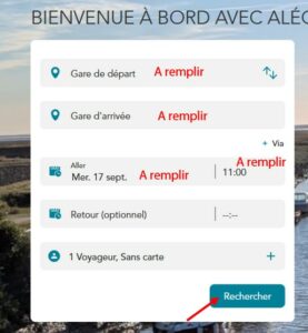 Sur la page d’accueil, vous écrivez votre gare de départ, votre gare d’arrivée, la date et l’heure du voyage. Puis vous lancez la recherche.